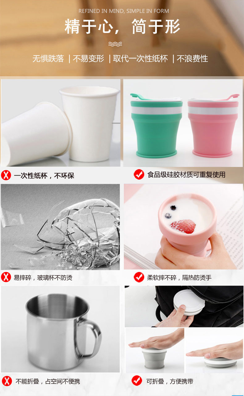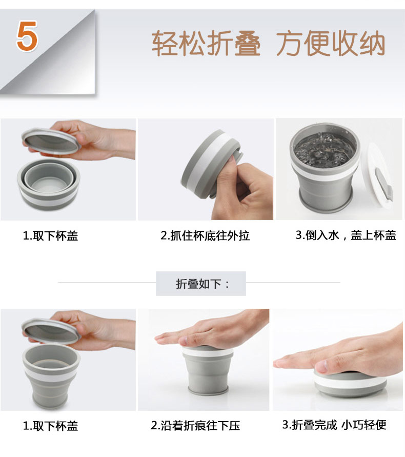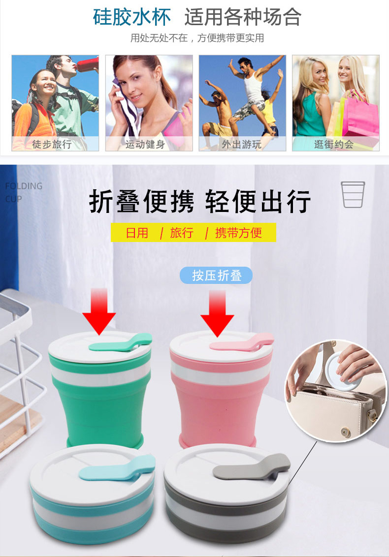 折疊式硅膠水杯成為運動以及郊游的便攜物品之一,水喝完后直接折疊放入口袋減小儲物空間替代了對水壺和瓶裝礦泉水的不足, 完全顛覆了消費者對硅膠折疊水杯的看法,硅膠折疊杯是一種攜帶方便、使用衛(wèi)生、具有雙層杯壁的折疊杯。外壁的兩個相鄰段通過螺紋連接,內(nèi)壁的兩個相鄰段為錐形配合,可上下移動。通過外壁螺紋旋轉(zhuǎn)驅(qū)動內(nèi)壁上下展開,實現(xiàn)杯形折疊和拉伸動能。